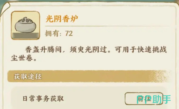 获取完文物之后就可以进行培养,相同的物品可以直接通过升星等方式提升战斗能力,另外玩家也可以参与城市尘世卷副本,获取的各类养成材料,都可以用来提升这些文物的等级,需要注意的是文物会分成四种不同的类型,养成材料也会有四种不同的设定,每个玩家都可以通过这些专属的材料,去提升对应文物的等级,如果对于文物的提升速度要求比较高,那还可以直接用光阴香炉,获得更多的挑战机会,这样就能刷到更多需要的物品,光阴香炉可以通过参与日常任务获取,比如参与逐鹿演武台。