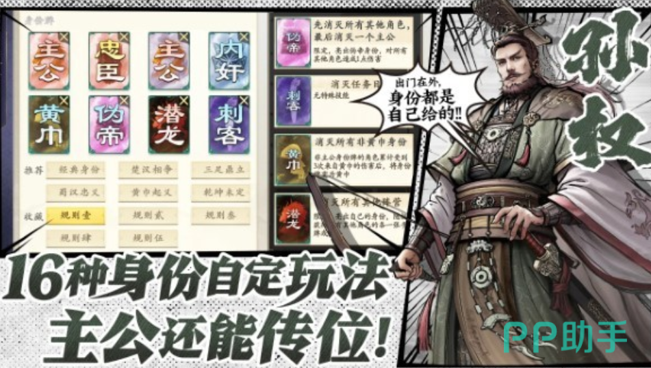 在游戏中涉及到16种身份,而这16种身份所代表的就是16个阵营,玩家可以自主的去设计身份的组合,还原历史上比较出名的名场面,最终让自己的体验感有所改变。玩家在体验游戏时涉及到的游戏对战,会分配对应的身份,而玩家可以借助卡牌效果技能释放跟阵营技能,来判断这个玩家的具体身份。一旦玩家推理成功,也满足了自己这一方阵营胜利的条件,那么玩家是有机会胜利的。