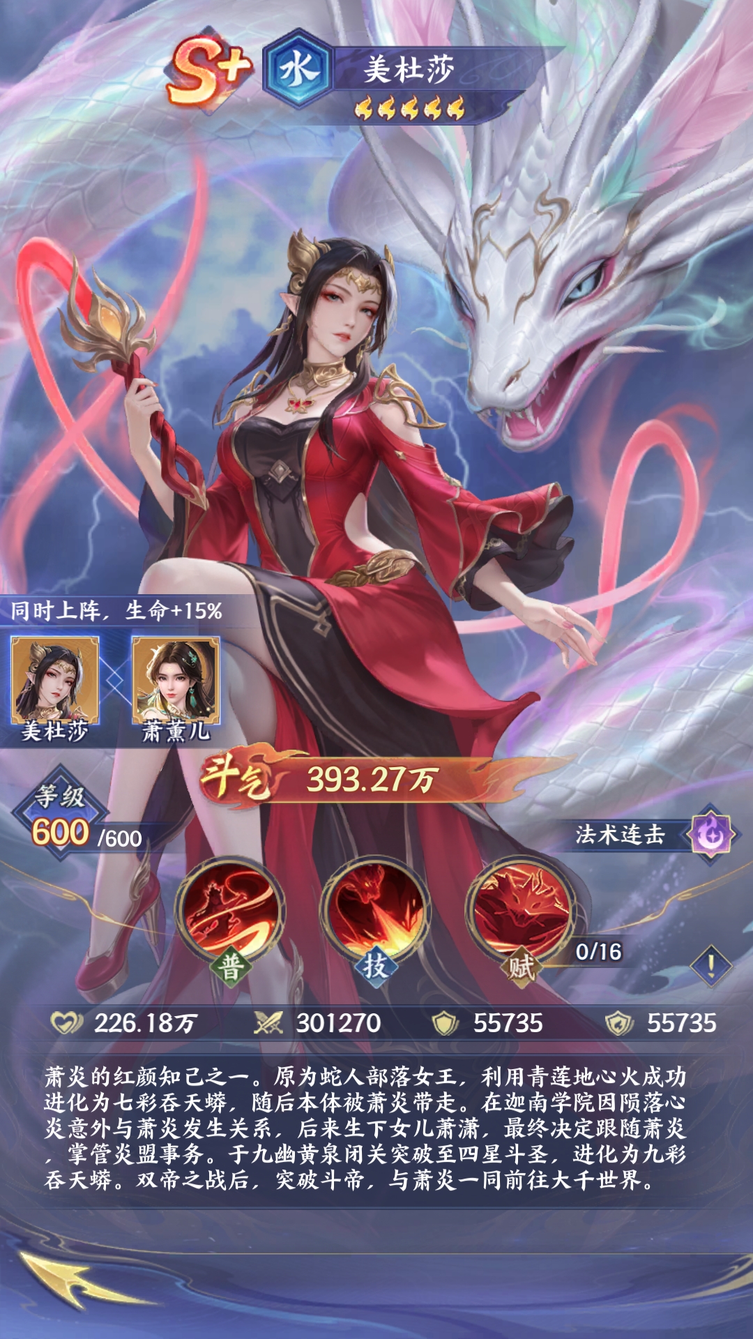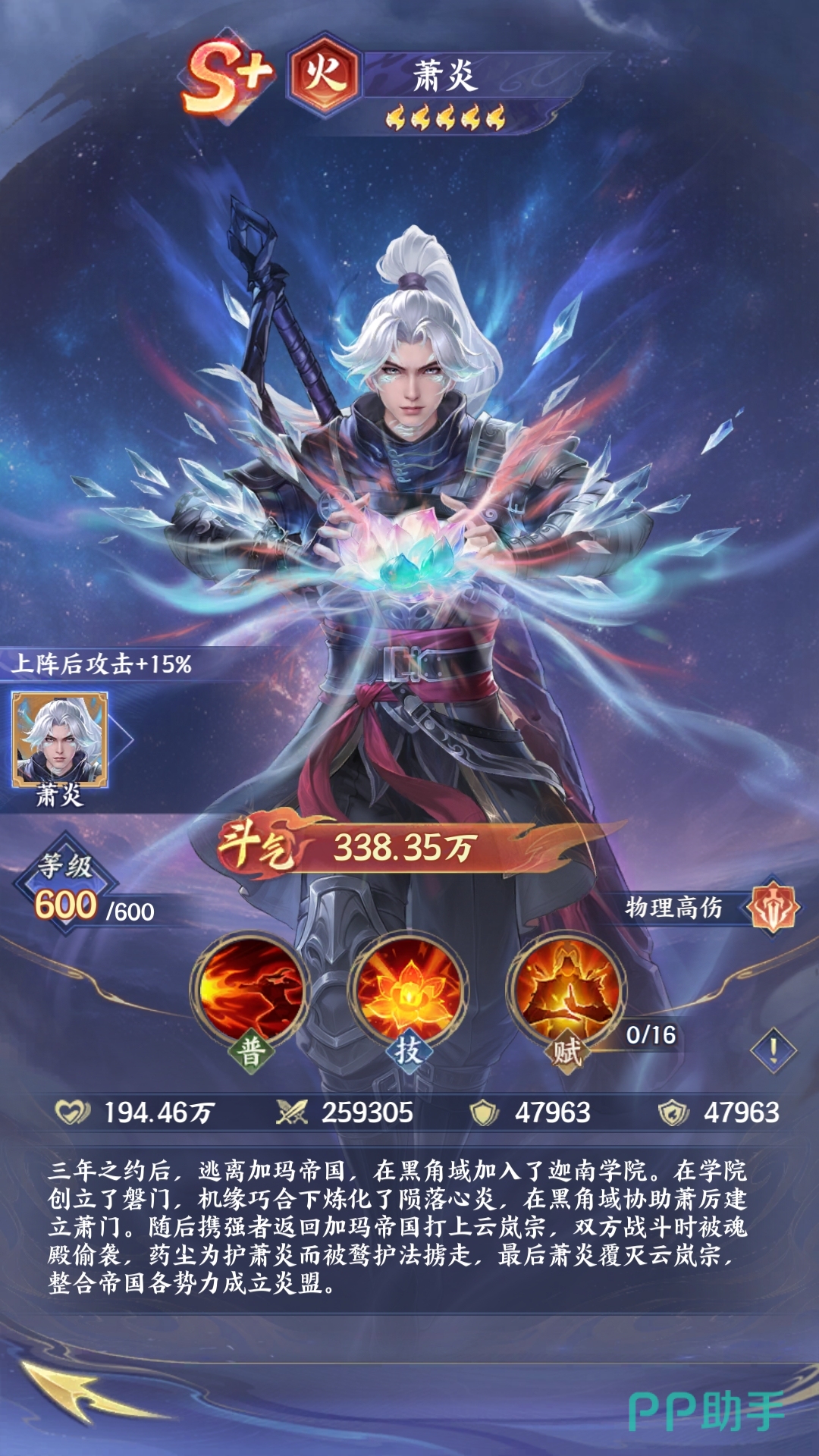 萧炎(火·物理高伤):主角战力标杆,延续原著火属性暴烈风格。普攻专注单体物理输出,大招“陨落心炎”具备前排破甲特性,配合天赋实现战斗中持续攻击力攀升。在搭配美杜莎等法系协同时,可最大化破防收益,构成双核驱动的物理爆发体系,为高难度单体挑战与竞技场斩杀线构筑提供稳定火力支撑。