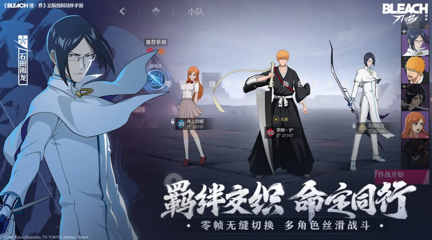 游戏之中也支持个阵容角色之间的连携技能作战搭配,例如黑崎一护可以和露琪亚进行协同进攻,两者创造双人拼刀,对敌人进行压倒性攻击,当然黑崎一护也可以搭配游戏内的石田雨龙亦或是井上织姬,利用好双属性的切换转化,造成大量的伤害输出。
