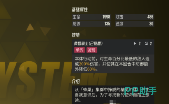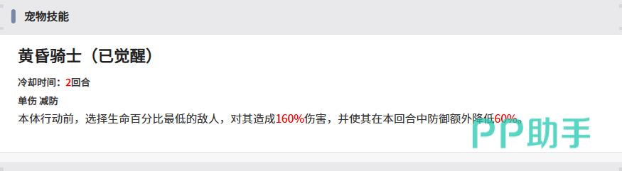 觉醒后的黄昏骑士释放的技能为单体攻击,可在自身行动前发动。该技能会自动锁定场上生命百分比最低的目标进行打击,造成高达200%的伤害。更关键的是,命中后会使目标在当前回合内的防御值额外降低60%,形成显著的破防状态。这一减益效果可叠加于每回合使用,使得敌方单位持续处于易伤状态,极大提升我方整体输出效率。