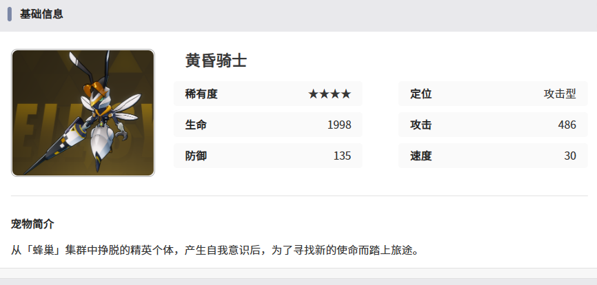 目前黄昏骑士的稀有度为四星,属于基础但实力不俗的智壳类型。其核心定位为攻击型单位,在队伍中主要承担破防与单体爆发的职责。与其他高技能频率的角色不同,黄昏骑士仅拥有一个核心技能,但该技能具备极强的战术意义——它不仅造成高额伤害,还能有效削弱敌方防御属性,从而为后续输出创造有利条件。