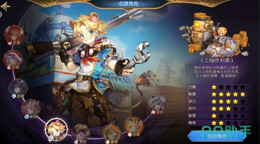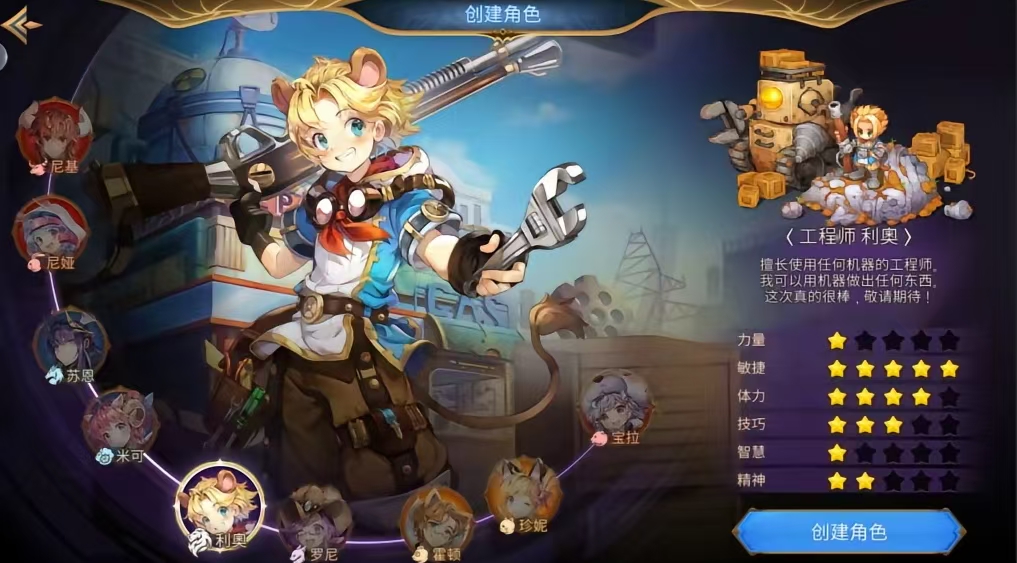 第三个推荐的职业是工程师利奥,利奥也是一个输出角色,不过他的控场能力很强,技能攻击的范围也很广,是一个群攻型的角色,适合新手玩家的地图中进行大范围的清怪。不过利奥成长过程中可能会需要一些资源,需要大家多攒一些。