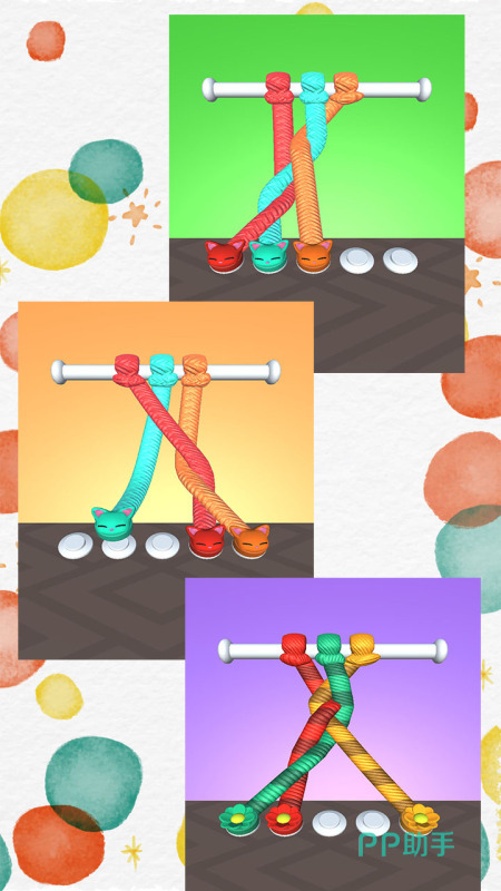 《彩绳排序3D版》每个绳子交错以及纠缠的形式都是不相同的,游戏里融入了多类型令人难以捉摸的解谜要素,并且设计了五彩斑斓的彩绳,每一个关卡中的通关思路,包括绳索设计的谜题机制,都有着其玄妙无比的设计,打造了令玩家们信手拈来的操控系统,在这里,需要运用你的慧眼如炬, 去解开相互交错的绳结。