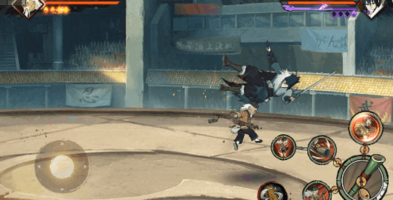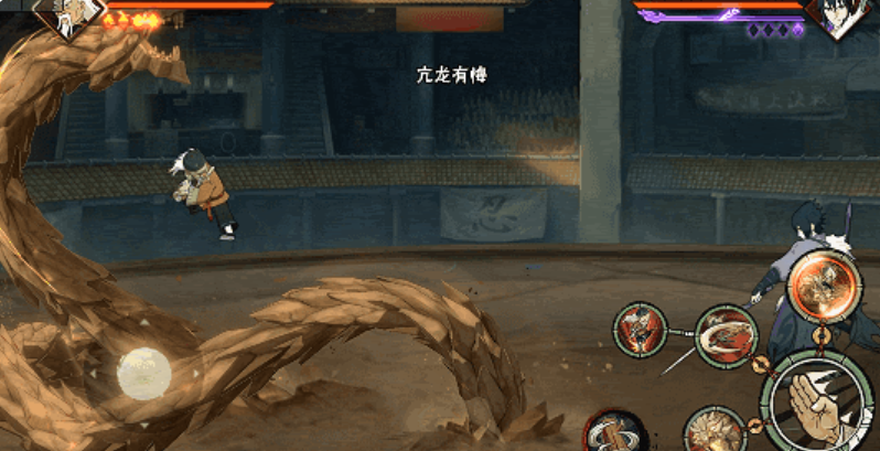 当大野木处于竹棍一定范围内时,可激活特殊子技能,点击后切换至“立棍”状态并规避伤害。在此状态下,一技能为腾空而起,释放尘遁查克拉后以岩石包裹手臂重砸地面,技能结束自动转为“离手”状态;二技能则生成多个岩锥环绕自身,随后向前突进打击路径上的目标,结束后回归“跟随”状态。其奥义技将在原地召唤两名分身协助作战,分身将抓取敌人,本体则沿竹枝高速穿梭进行连续打击,最终召唤巨型岩石巨龙持续输出,并将敌人封锁于石阵之中。