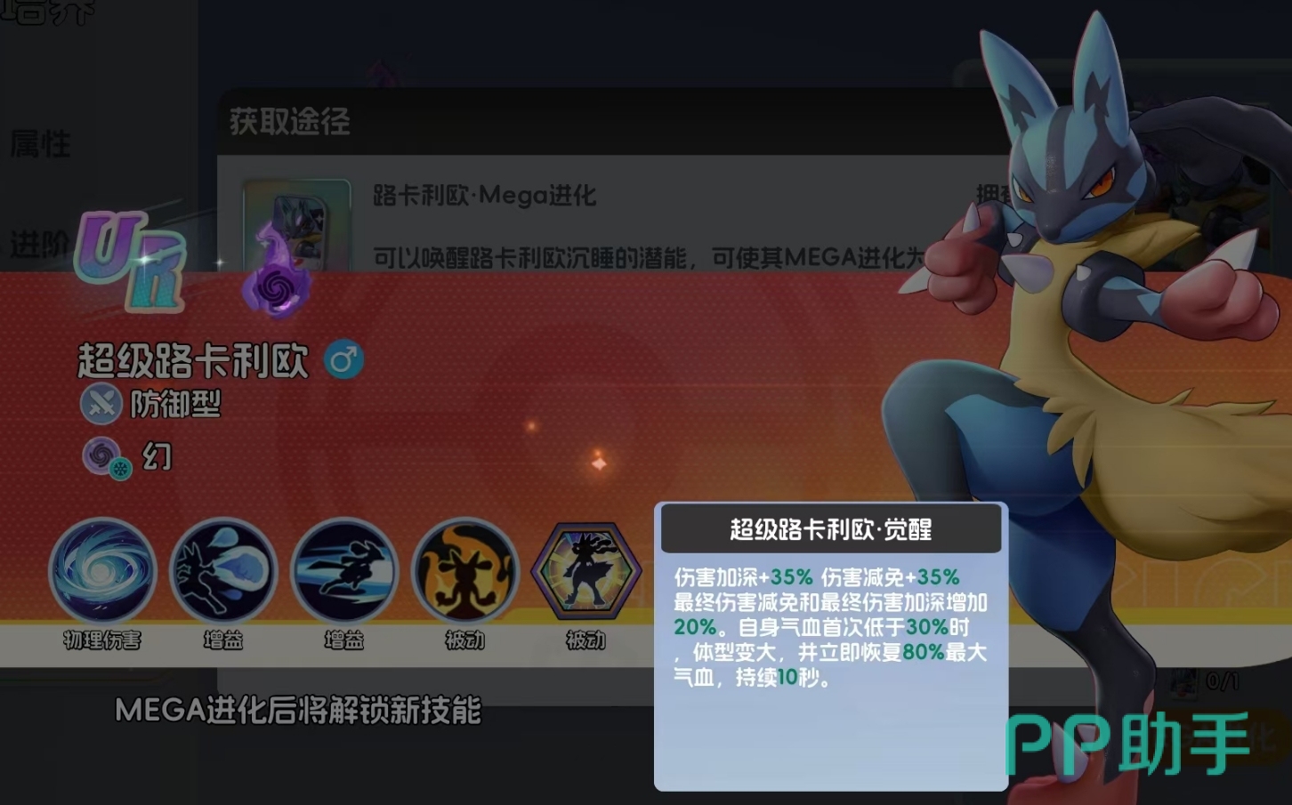 超级路卡利欧并非独立获取角色,必须由利欧路完成MEGA进化方可达成。该形态专属觉醒技能随MEGA突破等级提升而显著强化:初始阶段提供5%伤害增加与5%伤害减免;当MEGA突破达到满级(上限)时,两项基础增益同步提升至35%,并额外激活最终伤害增加+20%与最终伤害减免+20%效果。尤为关键的是,当超级路卡利欧生命值低于30%时,将触发体型变化,并立即恢复80%最大生命值,大幅增强其前排生存韧性与容错能力。