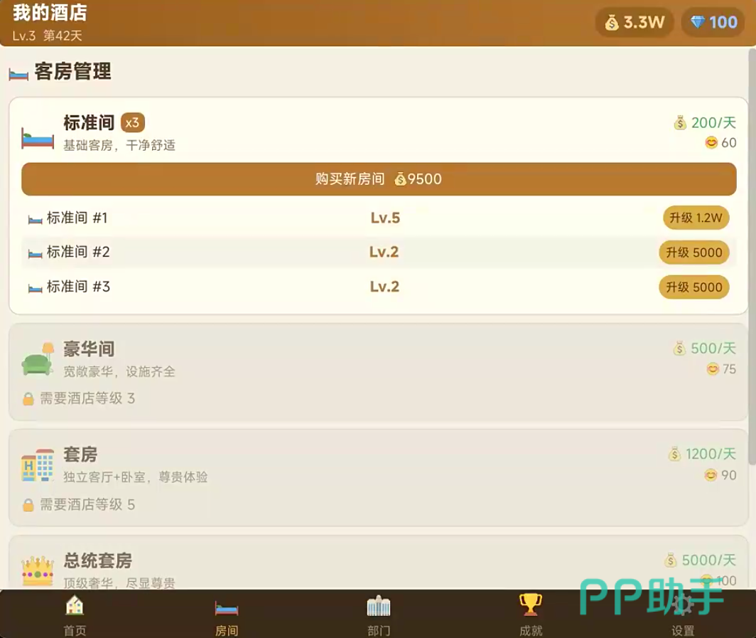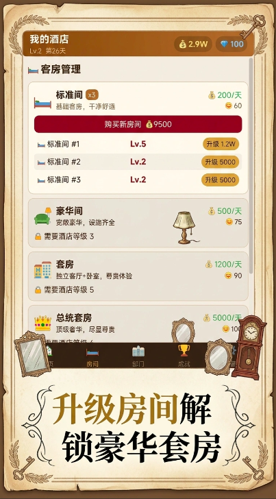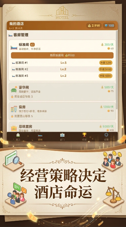 房间升级系统是核心玩法之一。玩家需依次完成内饰采购、装修施工、品质评级等步骤,提升单房间综合价值,从而带动房价上浮与顾客满意度增长。该机制高度还原现实酒店资产迭代逻辑,强调投入产出比与阶段性规划能力。