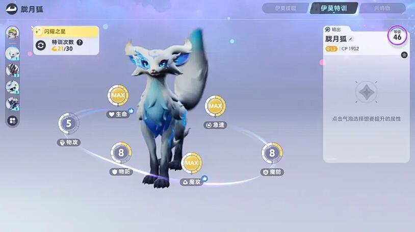 输出型推荐胧月狐,属于开荒主力输出手,开局邮件直接领取,无需捕捉。个体值五项全满,无需反复刷属性。18级时前往朝花村完成“狐影之谜”任务(限时5分钟内击败3波蓬蓬羊),进化后解锁“月华冲击”——长按技能键蓄力1.5秒,对直线10米内敌人造成光属性爆发伤害,面对草系BOSS花舞兰时,贴身绕至其背部(避开正面藤蔓攻击),连续释放两次蓄力月华冲击可直接破除其护盾,经验果优先喂给它,确保首日升至18级进化。技能升级顺序:月华冲击>普攻>闪避。