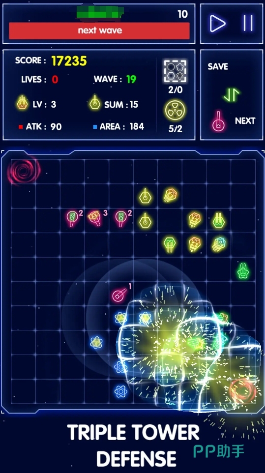 从名字上就能看出,这部游戏以三消玩法为核心,只要三个同类型同级别的防御塔能练成一条,它就会通过三合一的方式,把它们合成出级别更高的的防御炮塔,并且人们还能直接使用炸弹来攻击怪物,以及道具来完成防御塔等级的调整,令它们能以更科学的升级方案,来让自己能这部很有创意的游戏里享受快乐。