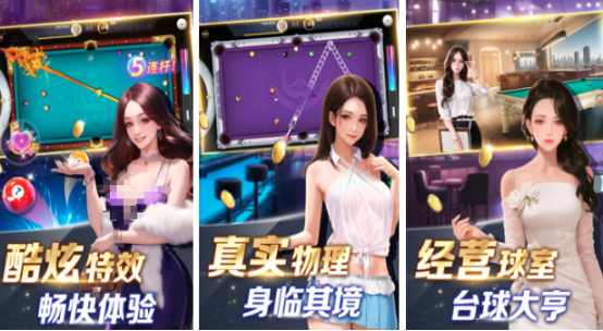 玩法与性能拉满的高人气手游,采用无比精美的画面与逼真的物理引擎,台球在桌面上滚动的过程当中,具体的物理碰撞与运动轨迹都非常逼真,给玩家带来真实的竞技快感。有个性化定制与特色经营玩法,加入台球厅经营特色内容,可经营自己的球厅升级设施,解锁新的房间。