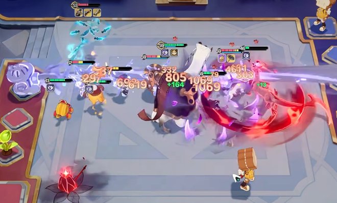 焰刃龙具备强大的单体压制力和防御能力,而流转仙子则擅长群体干扰与状态控制,两者在信物技能和羁绊加成的叠加下,战斗力实现质的飞跃。再辅以咬咬与奶丁汪的功能性支持,整个阵容形成攻守兼备、节奏流畅的作战体系。