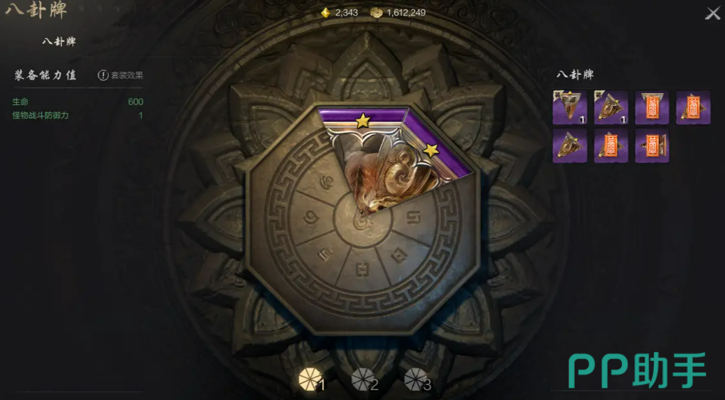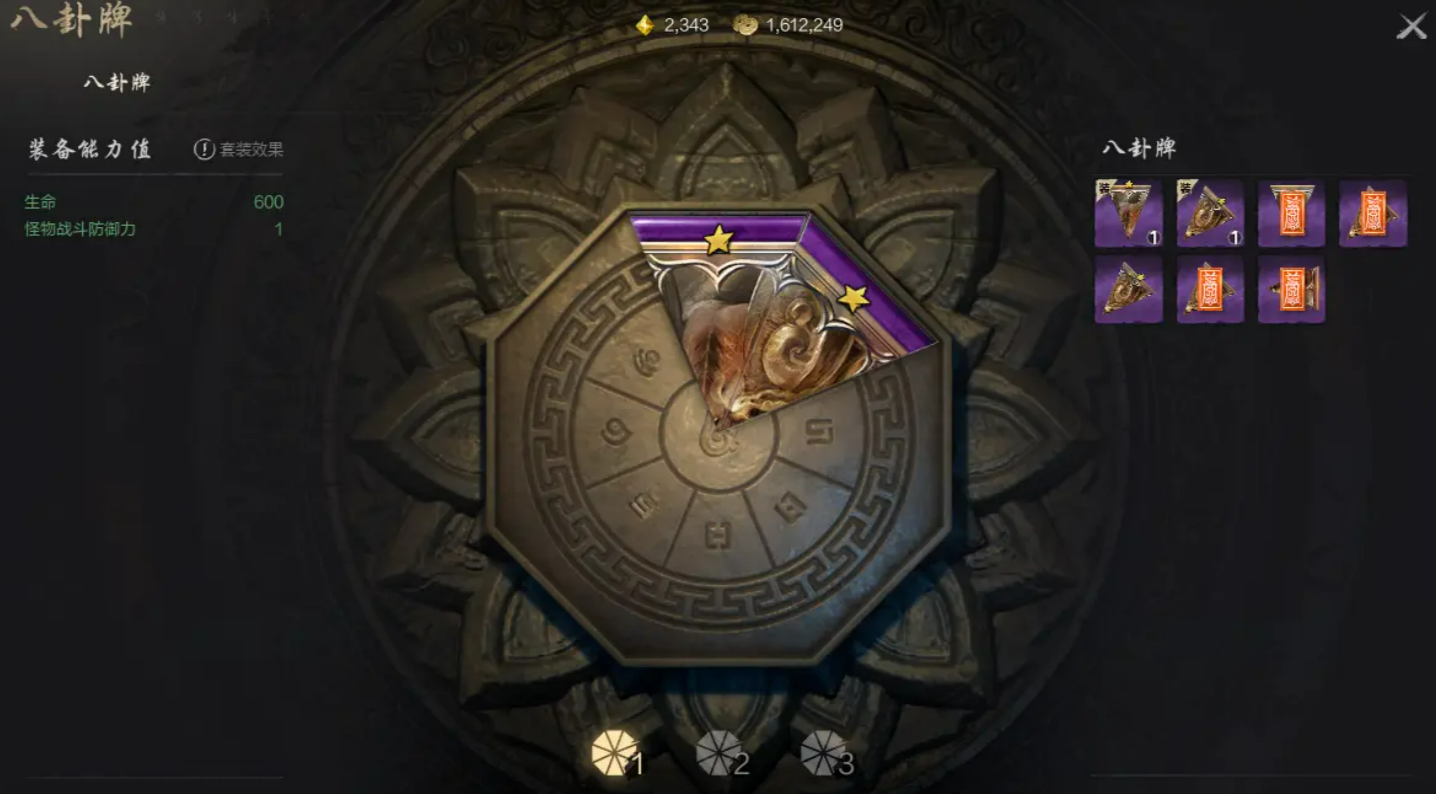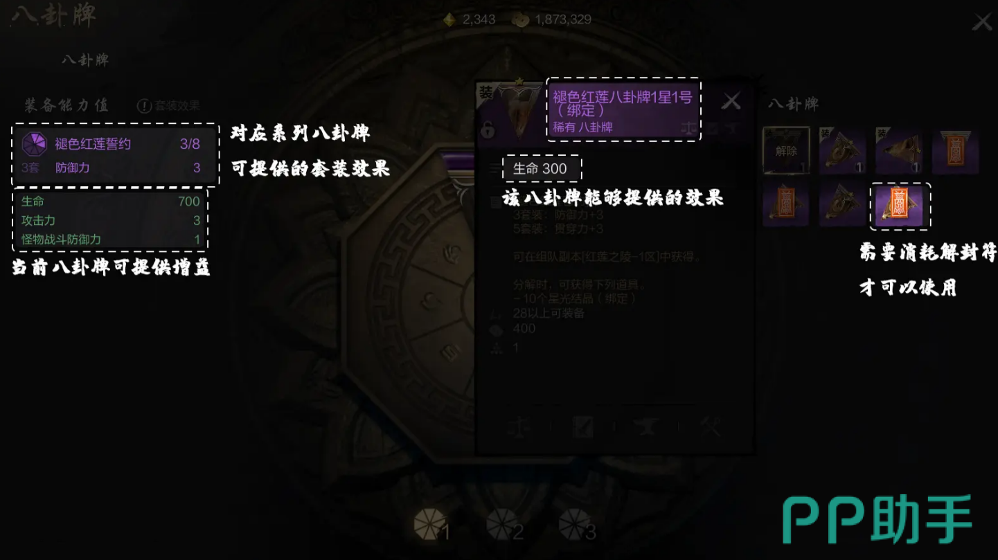 首先,八卦牌是一种通过装备来提升角色战力的特殊道具。每一套完整的八卦牌由1号到8号八卦牌组成,而每个位置上的牌号是固定的,譬如1号牌只能放在1号位上。值得注意的是,如果你背包里有一堆1号牌,也只能装备其中一张,这点一定要留心。八卦牌本身有着基础属性加成,但如果你能够凑齐一套完整的八卦牌,还能激活更强大的套装效果。例如,收集“褪色红莲八卦牌”系列装备三张时,可以提升防御力,装备五张则能增加贯穿力,套装效果能让你的角色更具战斗力。