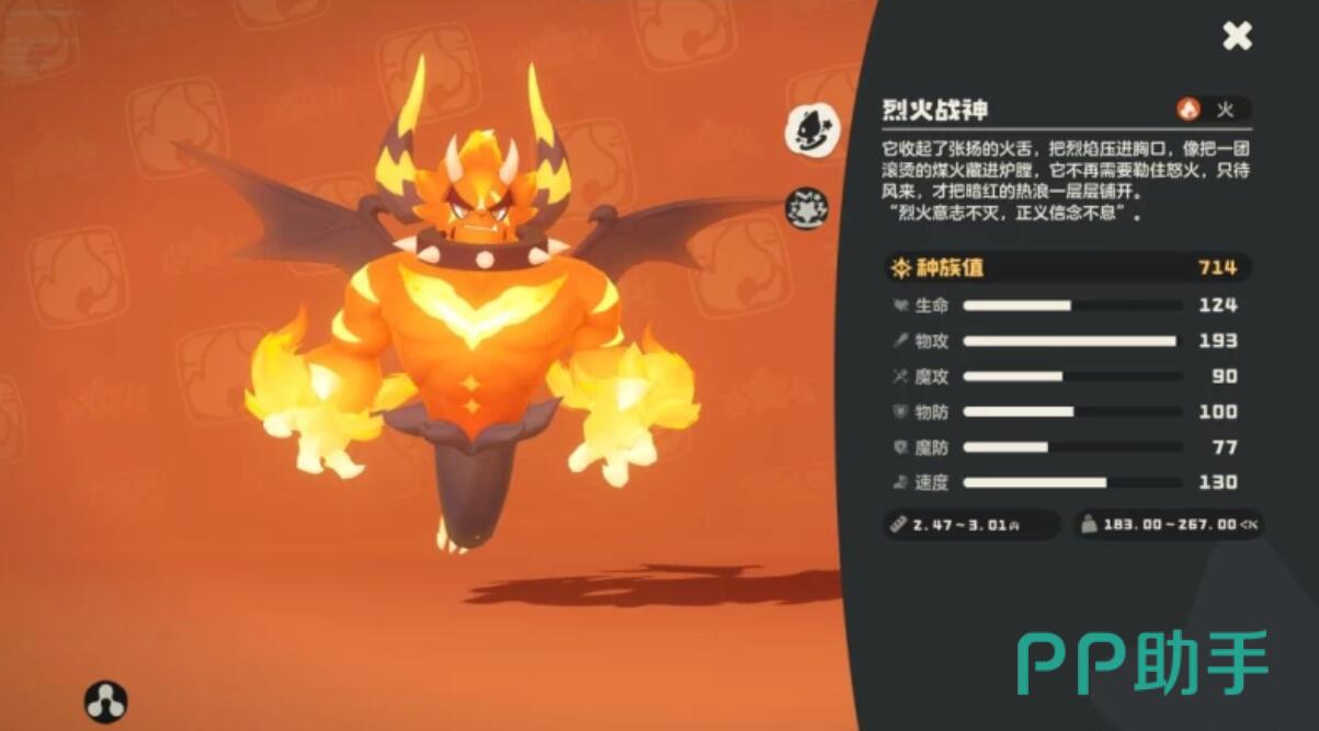 从战斗定位来看,火神核心优势在于高爆发输出与先手压制能力。完成首领化后,其物理攻击种族值提升至193点,配合固有特性“助燃”,在使用火系技能时可进一步强化伤害倍率。因此,推荐玩家优先完成全部进化与首领化流程,以最大化火神在中后期PVE推图及Boss攻坚中的持续输出表现。