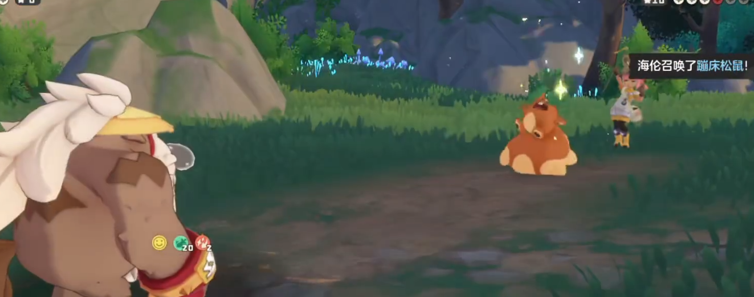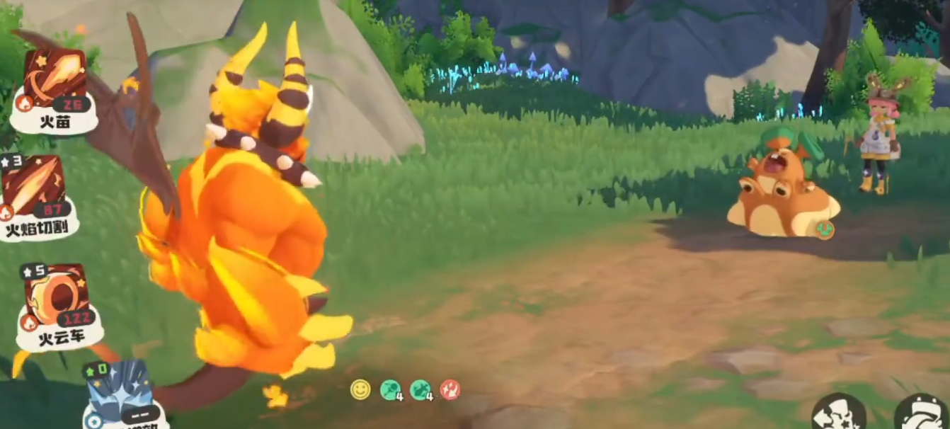 接下来出场的是普系精灵蹦床松鼠,其拥有“囤积”特性,且火系技能会受到土属性的克制影响。此时应切换至瞌睡王迎战,凭借其较强的物攻能力,使用一次二星技能“斩断”接上“崩拳”,便可顺利解决目标。第三只精灵为萌+草系的蒲公英娃娃,此时重新换上火神,利用火系对草系的属性优势进行压制。