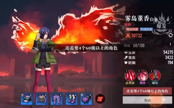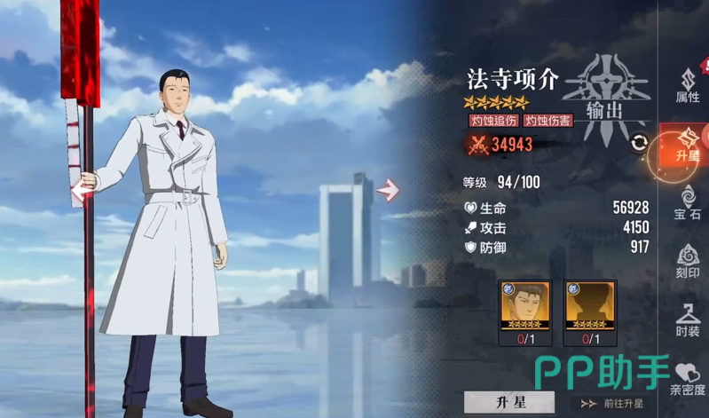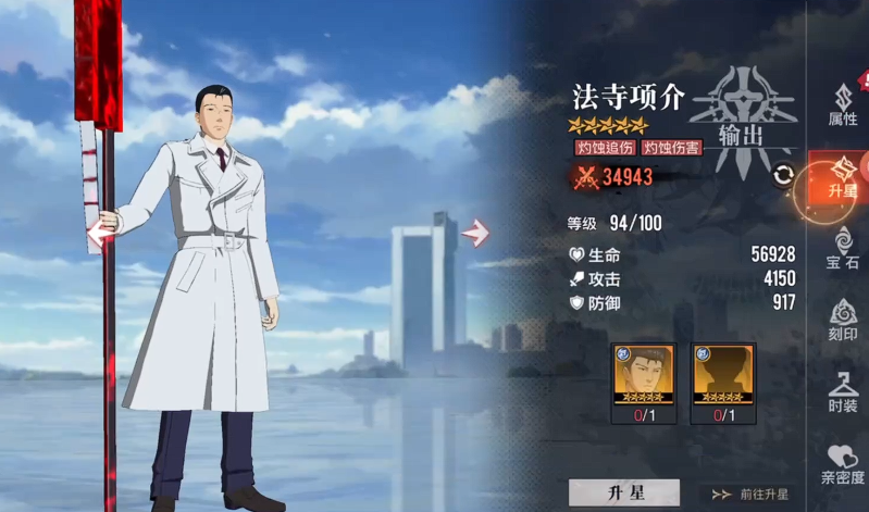 第二位重点培养对象是法寺项介,定位为高适配性副C。其核心机制为多段灼烧叠加与层数转化系统:每次技能命中均可施加独立燃烧效果,且层数随回合推进持续增益,最终转化为可观的额外伤害倍率。该特性使其成为“燃烧队”构筑基石,尤其在面对高血量群怪或具备减伤机制的精英敌人时,持续伤害曲线极为陡峭。作为五星角色,法寺项介的养成成本低于同阶输出角色,技能升级与突破材料需求更易满足,适合中长期阵容过渡与功能补强。