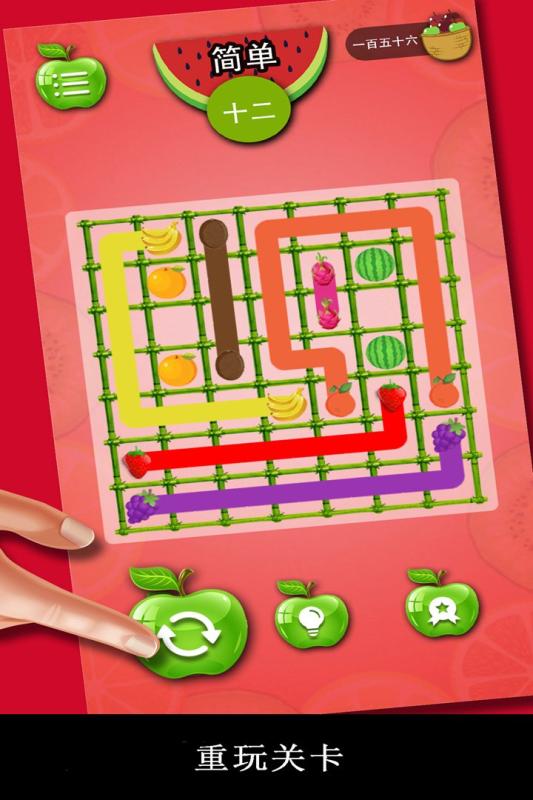 玩家需要做的就是点触屏幕上的水果,将它们连成不同颜色的线条。要遵循一定的规则,线条不能够出现交叉的情况,只有满足这个条件之后才能够顺利的通关,在连线闯关的过程中,你会感觉很容易上手。不管是新手玩家还是老手,都能够沉溺在游戏当中,整体的画面也很清晰,对于喜欢水果切切乐游戏的玩家们来说真是很棒。