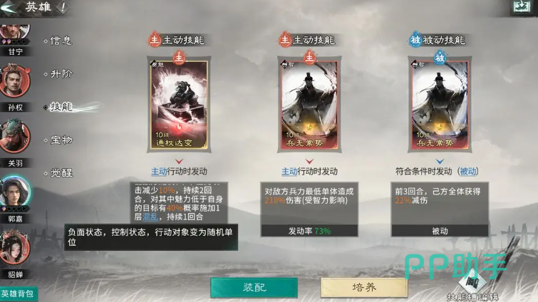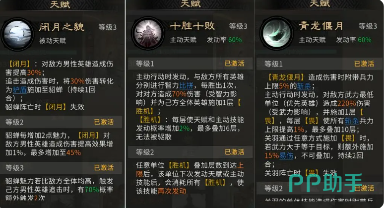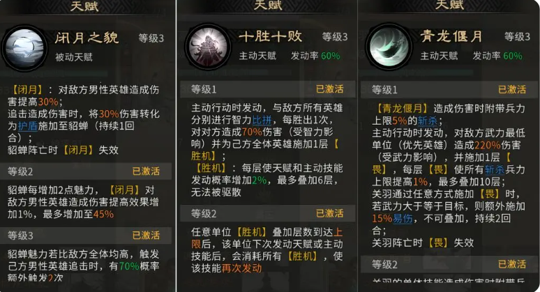 貂蝉的【闭月之貌】天赋可针对性提升对男性武将的伤害,配合其追击技能,还能将20%基础伤害转化为增益效果——若未触发魅力加成,则直接转化为增伤数值。郭嘉的【十胜十败】则在每次成功压制后,为全队提供1级临时升级,使所有天赋与主动技发动概率提升2%,最高叠加6层(即总概率提升12%),且该增益不可被驱散,大幅提升关羽技能释放稳定性。