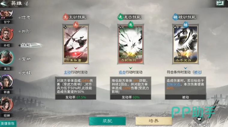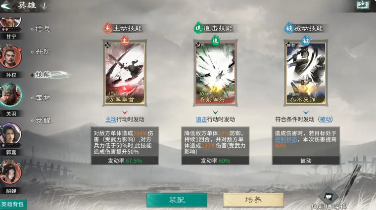 站位设计上,关羽需置于后排中央,前排配置单穿杨军以弥补其自身面板输出不足的问题;藤甲兵则前置承担伤害。郭嘉对兵种适配性较宽松,而貂蝉必须同时覆盖关羽与郭嘉的追击格,实现技能二次释放;关羽自身亦需踩中貂蝉追击格,以激活天赋联动加成。技能搭配方面,推荐主动技选用【万军取首】——当目标兵力低于50%时,关羽自身伤害提升50%,完美契合其斩杀定位。