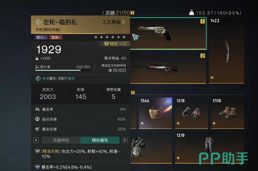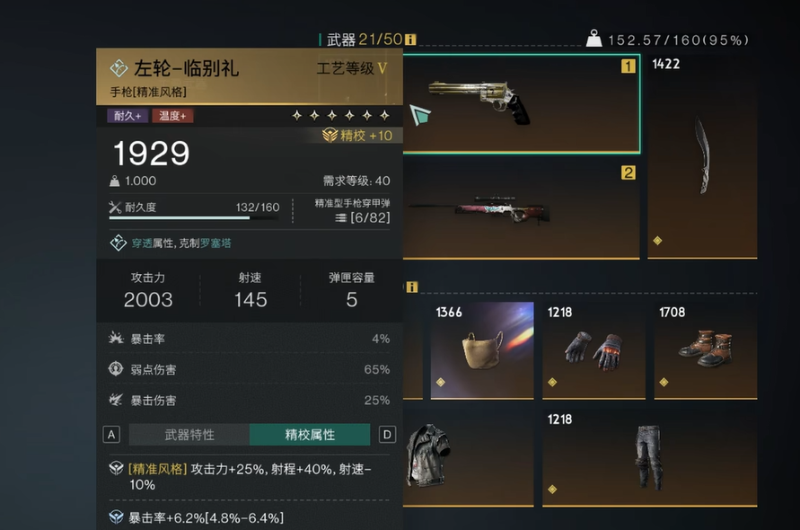 首先要提的,必定是“临别礼”这把四星手枪。虽然它的星级并不算最高,但却是前期非常值得培养的选择。别看它的基础属性看起来平平无奇,但这把枪最大的优势在于它的特殊技能。使用这把手枪时,有机会进入“快枪手”状态,角色的攻击速度会大幅提升,并且一次性装填所有子弹。除此之外,击中敌人时还可能消耗额外子弹,虽然这会稍微减少子弹数量,但能够大幅提升伤害输出。在弹药充足的情况下,它的表现甚至能让你秒杀敌人,十分值得在早期就加以培养。