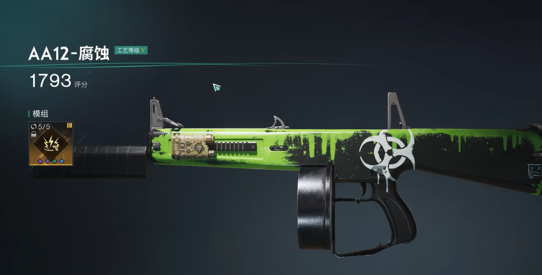 接下来要说的,是霰弹枪中的“AA12-腐蚀”。这把枪堪称混伤神器,其攻击力高达36*5,弹匣容量也有18发,比起一般霰弹枪要强得多,且拥有180的攻击速度。更为强大的是它的特殊效果:攻击时有70%的概率触发电涌,造成电击伤害。虽然电涌无法引发电击异常状态,但其触发后的暴击伤害会有所提升,暴击几率达到15%,最多还能叠加10层。这个特性使得它在近战中十分可怕,打出暴击后能够给敌人造成极高的伤害,甚至可以达到150%的增幅。如果你喜欢在战斗中拥有高爆发的输出,那么这把武器一定是你不容错过的存在。
