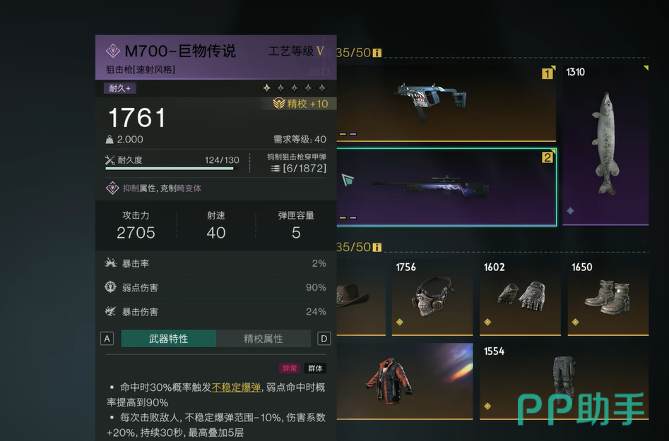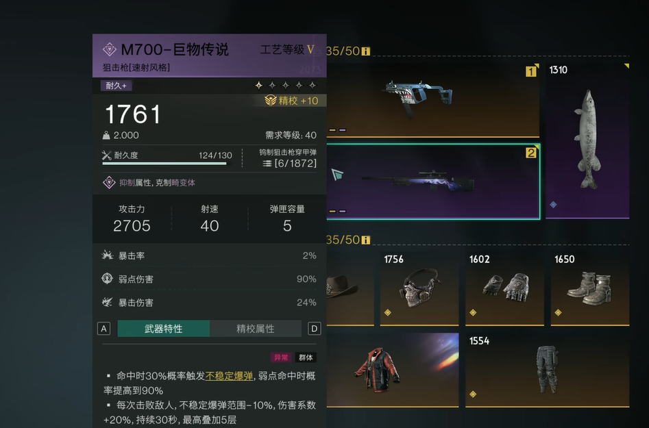 不能不提的还有“小白鲨”,这把枪的名字听上去也许没那么威猛,但它在攻击速度上有着显著的优势。基础伤害不算高,但它的攻击速度达到了1000,非常适合进行快速的持续输出。而且,它的特性之一是能在连续命中敌人15次后触发不稳定爆弹效果,爆炸的伤害随着命中次数的增加而逐渐增强,尤其是命中敌人弱点时,爆炸伤害还能翻倍。可以说,这把武器的持续输出能力非常强大,战斗中的稳定性也非常高。