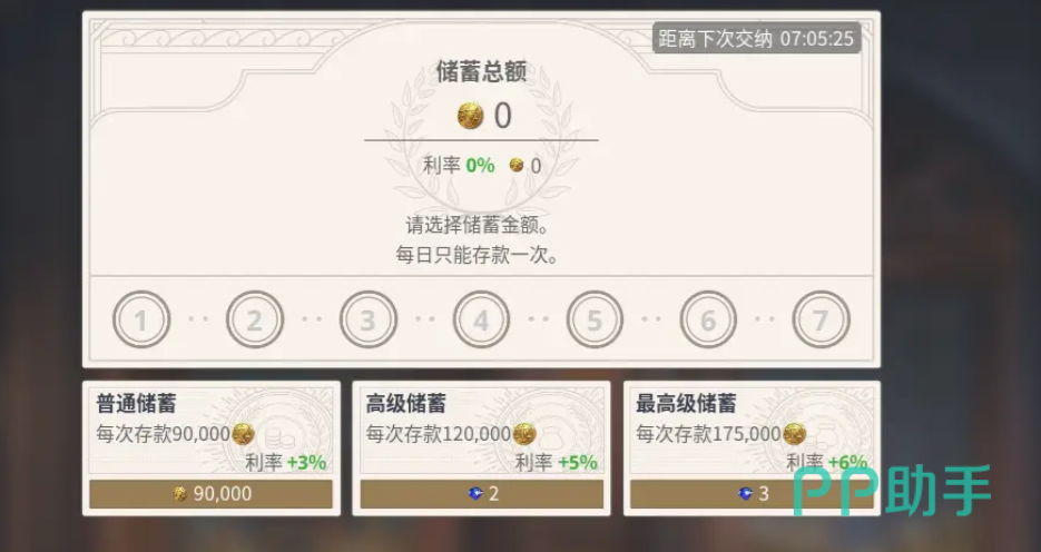 除了主动赚取达克特外,合理的资产管理同样重要。进入“银行”系统后,可使用三项关键功能:其一是存款服务,提前存放资金可防止因海战失败或意外事件导致资产损失;其二是储蓄计划,设定为期7天的周期,每日存入固定金额,到期后可取回本金并获得额外利息;其三是定额保障,若航行途中发生重大事故,可通过此服务申请赔偿,降低经济损失风险。