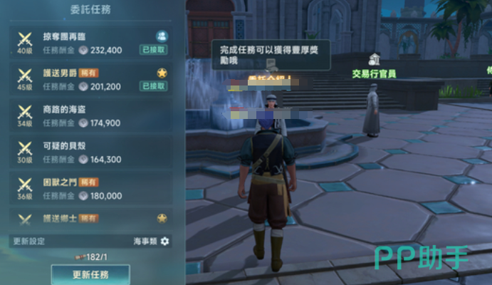 想要在游戏里体验海事玩法,那就需要先去港口,在港口这里会有委托人,会委托玩家大量的海战任务,每一个任务都有不同的酬金,并且根据任务难度的不同,都会划分出相应的等级,完成任务之后,玩家还有机会获得一些物品的奖励,可以根据自己的能力,在这里选择不同的海事任务,大部分都是海战玩法。