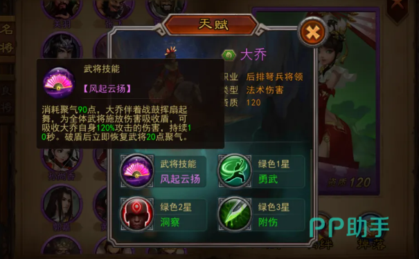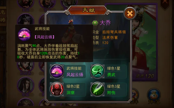 周瑜与大乔共同构成辅助体系,二者同时上阵可激活专属羁绊。大乔主司能量调度与破盾支援,其技能“风云云扬”消耗90点能量,依据全体友军所受伤害总量进行转化——在吸收相当于自身120%攻击力的伤害后,可在10秒内对敌方施加破盾效果,并为我方全体提供20点聚气。该机制大幅提升了团队技能循环效率与关键控制链衔接稳定性。