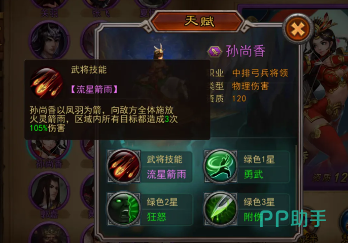 孙尚香承担主力物理输出职能,建议部署于中排。其核心技能“流星剑雨”可对敌方群体发动三次范围打击,每次造成105%攻击力的物理伤害。作为弓兵系将领,她对敌方中后排具有精准压制力,尤其擅长在聚气充足时释放大招,实现爆发式清场。需注意:当己方输出压力增大时,应同步关注敌方核心输出位动向,并确保前排未被快速突破,以维持孙尚香的安全输出环境。