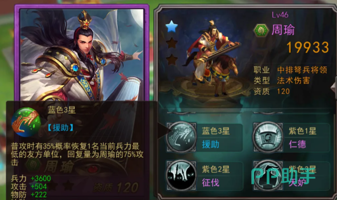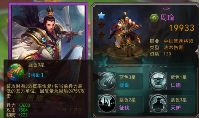 周瑜则侧重持续治疗与战力维持,其普攻拥有25%概率为目标队友恢复相当于自身攻击力75%的兵力值。该回复量直接受周瑜自身攻击属性影响,因此在培养过程中需同步提升其攻击成长。作为中排弩兵将领,其法术伤害输出偏低,但援助类技能在该阵容中发挥稳定增益作用,有效延长核心输出单位的持续作战时间。