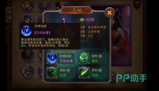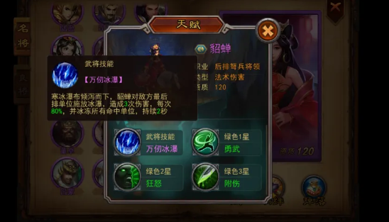 貂蝉负责关键控制与后排压制。其技能“万仞冰瀑”可锁定敌方末排全体目标,连续发动三次攻击,每次造成80%攻击力的伤害,并附带2秒冰冻效果。虽单次控场时间较短,但高频率触发与多段命中特性,使其能高效衔接后续控制或爆发技能,形成连贯压制链。在整套阵容中,貂蝉补足了控制维度,使队伍在攻防节奏、技能衔接与战场容错率方面达到均衡状态。