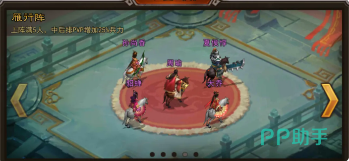 首选推荐阵容为“瞎香队”,推荐搭配雁行阵。该阵法在满编(5人)状态下,可使中排与后排单位获得25%的属性加成。该配置在竞技场等PVP场景中具备显著优势。阵容成员包括夏侯惇、孙尚香、周瑜、大乔与貂蝉。其中夏侯惇作为前排核心,具备高承伤能力:其护盾量扎实,且“煞气护体”效果可吸收相当于自身最大生命值45%的伤害;触发后10秒内,对攻击者造成相当于其18%攻击力的反伤。综合生存与反制能力,使其成为兼具坦度与干扰性的优质前排。