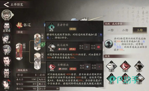 最后一位推荐的是张辽,常用于统帅位发挥其战术优势。其主动技能不会触发敌方反击机制,因此在对抗依赖反伤流派的阵容时具有天然克制作用。若一次技能命中两个及以上目标,则可在本回合为队友施加冲锋状态;若配合骑兵单位,更能额外追加一次攻击机会。这一特性使其成为骑兵阵容中的关键联动点,大幅提升团队整体输出频率与爆发能力。