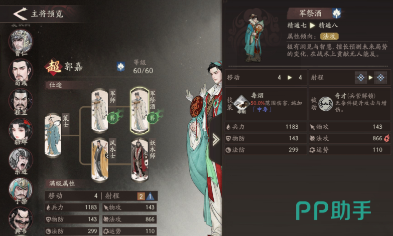 第四位是郭嘉,典型的谋略型武将代表。他的技能伤害会根据与敌人的距离远近动态调整,距离越远,造成的伤害越高,最高可比基础数值提升40%。二阶技能附带控制效果,使其在前期即可胜任控场职责。随着等级和装备的成长,其整体输出效率逐步攀升,在挑战BOSS副本等高强度内容中展现出强大压制力,属于后期成长空间极大的策略核心。