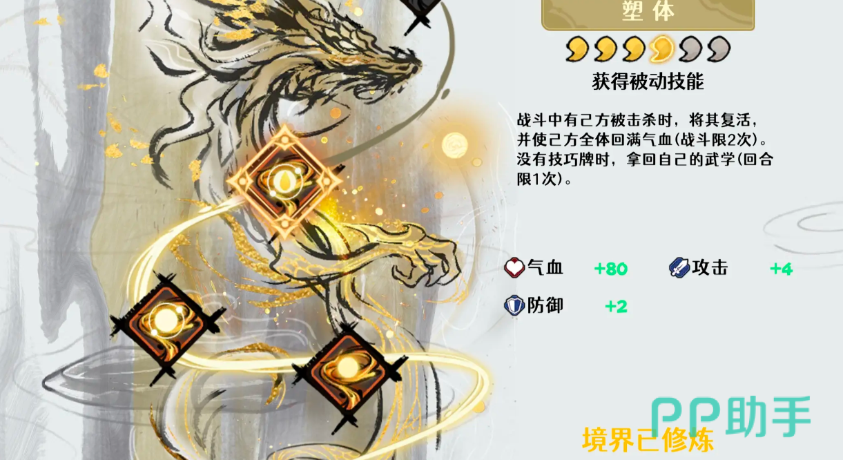 其境界被动赋予极强团队续航能力:当己方单位被击杀时,立即复活该角色,并使全体友方恢复满气血。此外,在无技巧牌可用时,可回收自身已打出的武学卡,形成稳定循环。该机制在高难度副本与PVP对战中均展现出顶级保核强度,是逆转局势的关键支点。