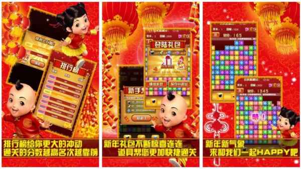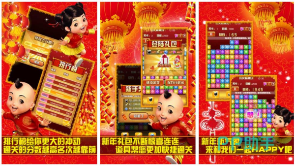 此游戏以新春佳节为主题,为大家提名着有趣的益智休闲消除娱乐玩法,竞技模式简单易上手,无论老人小孩,都可以尽情在此展开消除竞技。值得一提的是,《新春消消乐》中的消除元素,是各种与春节有关的小图标,例如大红灯笼、金灿灿的元宝等,通过调换相邻图标的位置,促使三个或更多的相同物品连接,便可以完成消除了。