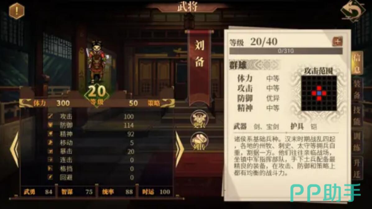 但是人物方面,终局前需确保刘备性格值统一倾向:仁厚路线要求仁厚值≥95,并完成所有支线对话(如第三十七关赦免黄巾残党、第六十五关触发陈到效忠事件)。阵容配置推荐关羽(武圣)+张飞(铁壁)+诸葛亮(天象)+赵云(龙胆)+糜竺(仁心),其中诸葛亮必须装备羽扇(火系策略伤害+25%)以抵消曹操的水域地形加成。张飞需通过升迁解锁不屈特性(濒死时格挡率100%),用于承受夏侯惇的拔矢啖睛爆发伤害。