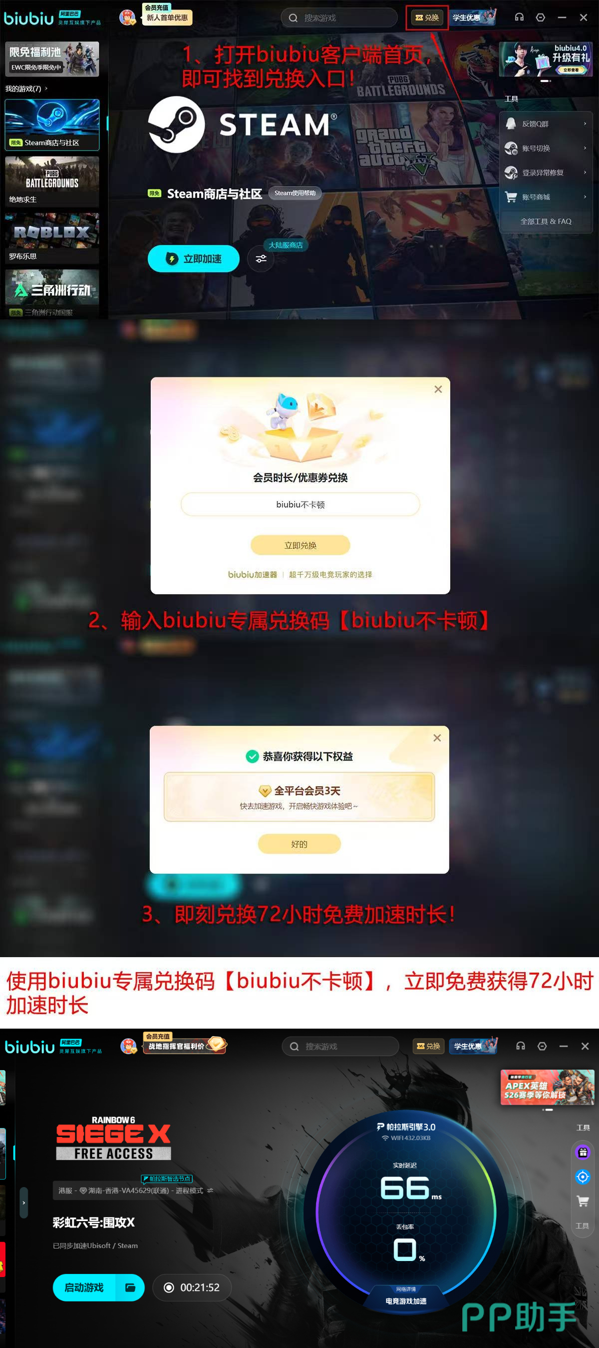 为降低新用户接入门槛,biubiu同步启动限时体验计划:完成注册即可免费获得24小时无限制加速服务;输入专属口令【biubiu不卡顿】,额外解锁72小时强化加速权益,累计可享96小时高品质网络支持。