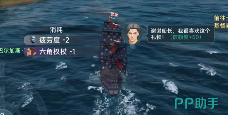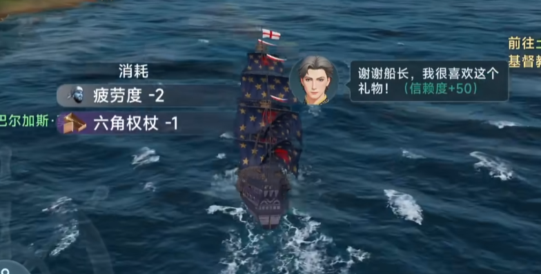 还有一种方式就是海上处理事件,在出海以后在大海上航行冒险的时候会随机出现突发事件,玩家解决这些突发事件后就可以发现自己的航海士头像右边的礼物图标可以点击了,玩家只要拥有自己的航海士所喜爱的礼物就可以点击赠送给相应的航海士增加航海士的信赖度,两种送礼物的方式都有一定的概率,所以送礼比较麻烦,但是收益还不错。