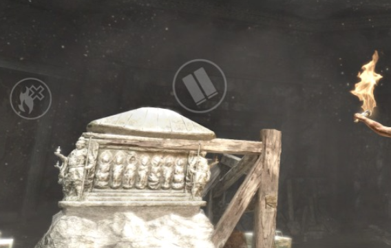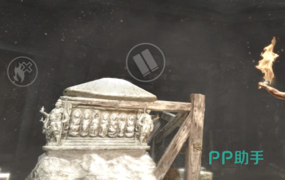 拾取宝物后,绕至瀑布后方,即可发现古墓入口。进入后需使用斧子作为攀爬工具,逐段向上移动。抵达顶端后点燃固定火把,继续前行至营地场景,寻找名为“劣民之坟”的特定墓室。该区域内分布多具遗骸及铁制囚笼,需推动右侧笼体使其坠落,从而触发机关,使左侧金属平台开始上升。