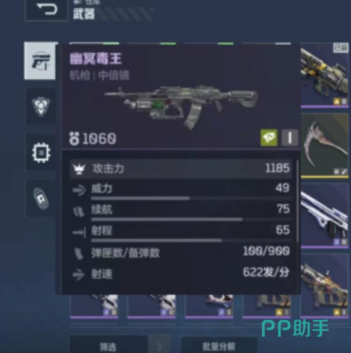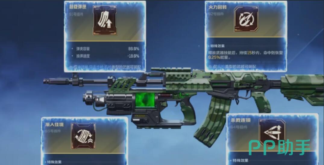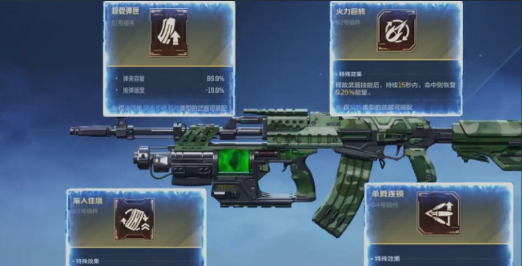 1号插件为核心续航组件,主要功能为提升弹匣容量并实现多重装填机制。启用后可消除换弹硬直,保障战斗全程火力不间断。该插件特别适配幽冥毒皇的高射速特性,使其在连续压制敌人时保持稳定DPS输出,有效避免因弹药中断导致的节奏断裂。