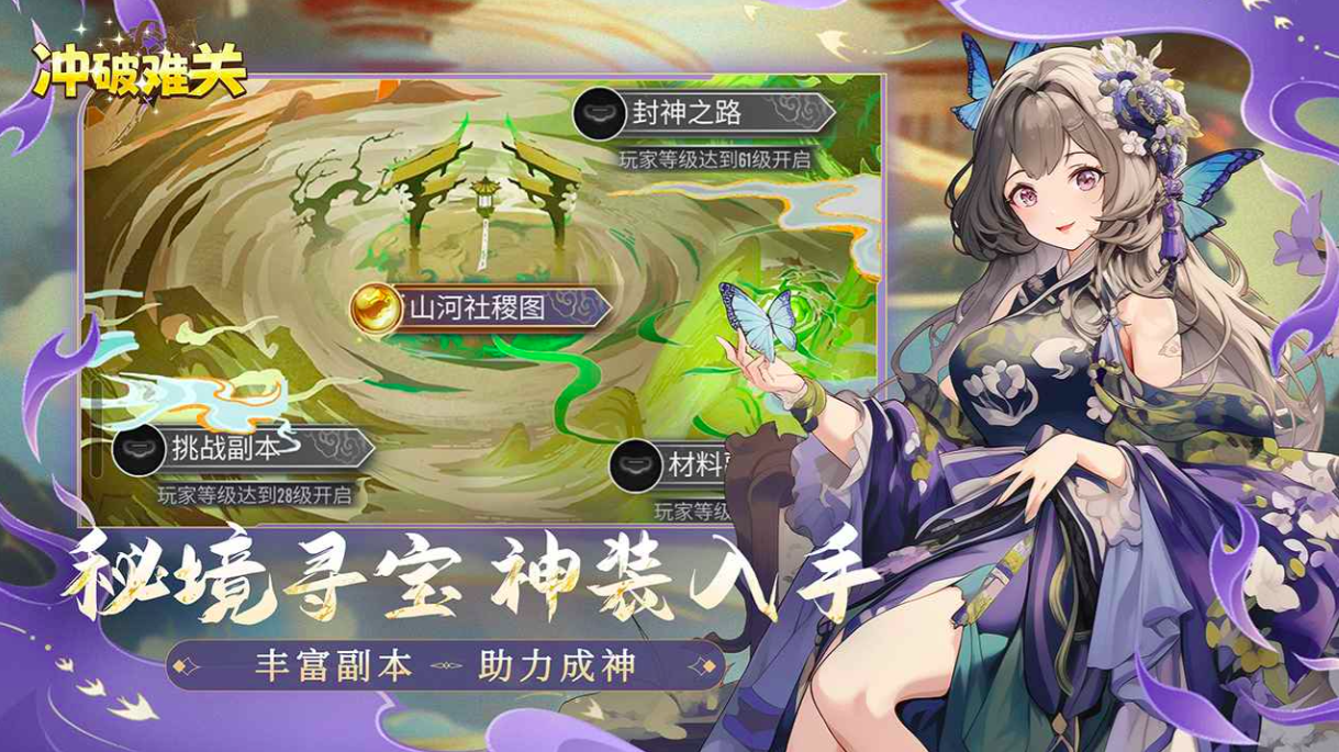 全新设计的秘境寻宝玩法涵盖四大核心模块——封神之路、山河社稷图、挑战副本及材料关卡。该系统大幅优化资源产出效率,高品质装备与稀有养成材料获取路径清晰,对零氪或轻度投入玩家同样友好,保障流畅战斗体验不受成长节奏制约。