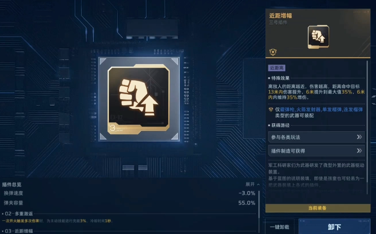 第四插件应依据副本类型动态调整:面对大量小怪密集分布的关卡,选用【百万伏特】可触发范围电击效果,实现高效群伤;而专精单体高难目标(如阶段型BOSS)时,【亲密距离】能进一步强化贴脸伤害系数,提升单点爆发阈值。
