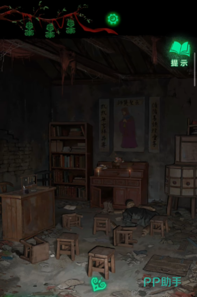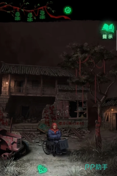 离开民居,在村口石碑嵌入石片,按笔画线索点击石块开启学堂门,进入学堂与木偶手互动,用玩具手枪换到直尺,之后利用直尺从另一房间墙缝挑出红绳,回到学堂将红绳用于西洋镜,查看西洋镜获取线索,据此调整书桌物品得到风铃,回到村口,触发剧情后,将风铃挂在特定架子,获取门锁线索阳阴鬼仙凡,前往村长家二楼输入密码进门,在屋内冰箱用棺材钉打开小棺材拿到短木条,砸开墙壁砖块按线索调整箱子得到朱砂。