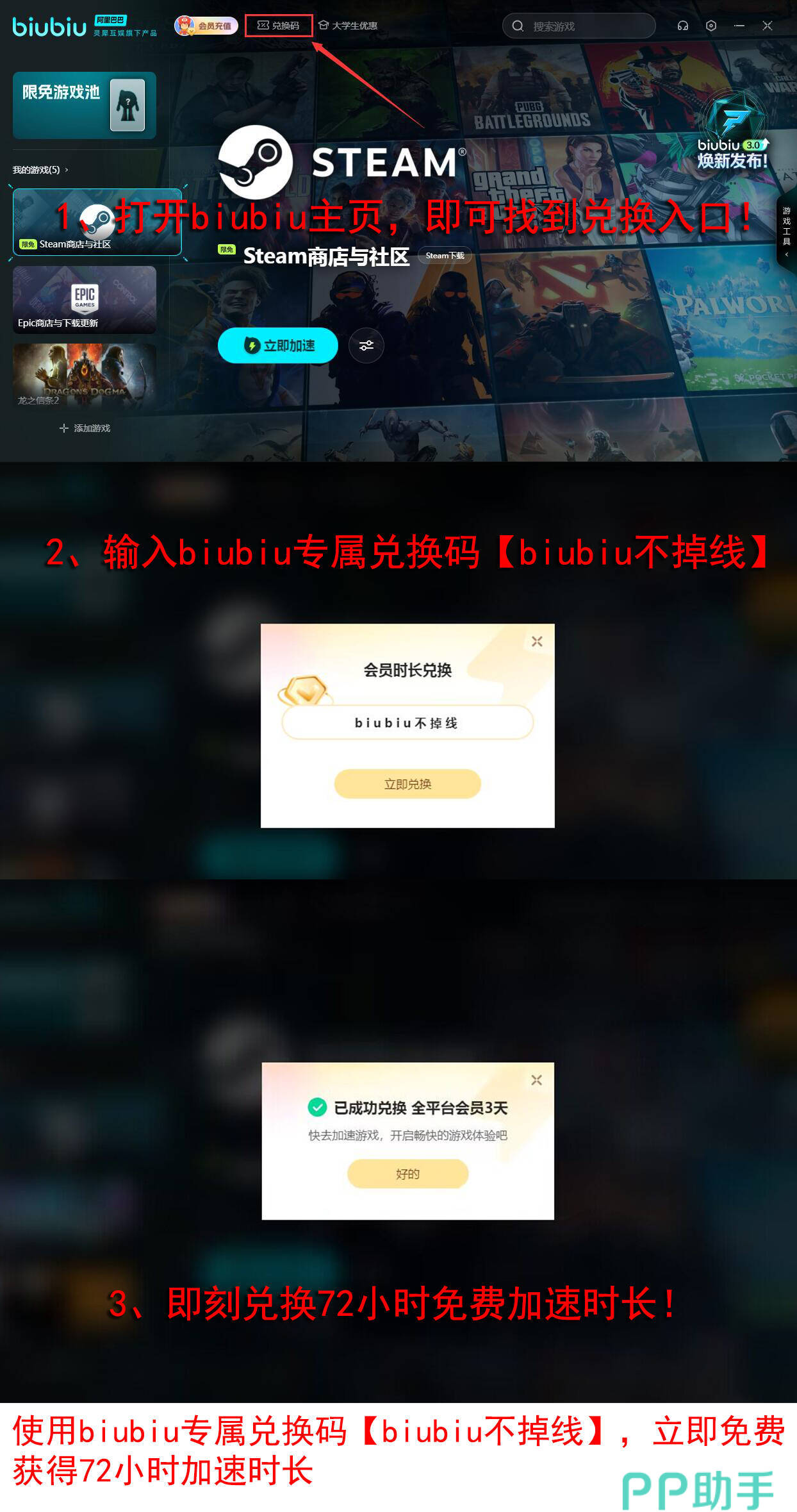 现在有不花钱的时长送各位去体验:首次注册立即享受3小时,按照下图的方法输入一个暗号【biubiu不掉线】又会白得72小时,而且两个时长一起领用不冲突,加起来一共有75小时了,这兄弟能处啊。