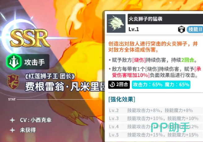 进一步觉醒至“火炎狮子的猛袭”后,其穿透伤害直接提升至10%,同时在烧伤状态下造成的伤害增幅可达30%。这一强化使得他在面对群体敌人或高防御单位时依然能保持稳定的输出效率。凭借此特性,费根雷翁已在现版本中跻身T0级火焰输出行列,是构建燃烧阵容时不可替代的核心主力,建议置于主C位进行培养。