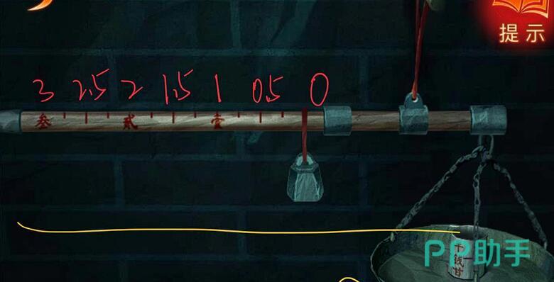 继续清空容器倒入苦原料,移动秤砣至“壹”字所在竖线(刻度1)时平衡,得出半钱甘等于一钱苦。配方中苦需一钱半,即一杯半(倒一整杯再加半杯)。最后测试酸原料,秤砣移至“贰”字竖线(刻度2)时平衡,表明半钱甘等于二钱酸,因此一钱酸仅需半杯。实际调制按“两杯辛、一杯半苦、半杯酸”操作即可。需注意游戏判定机制特殊,若未触发成功,可尝试微调:改为两杯辛、两杯苦、一杯酸,多数玩家实测此法更易通过,不然的话会触发牛马咖啡。