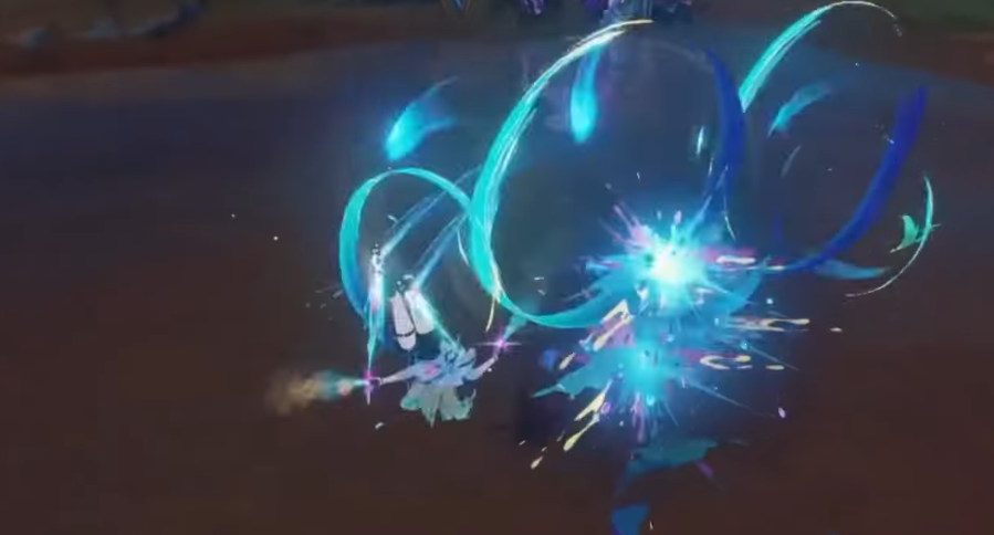 「共鸣技」具备双重操作逻辑:短按释放低倍率伤害并进入待机衔接态,此时可立即接续普攻第二段;长按则在「绮彩巡游」状态下造成更高伤害并主动退出该状态。若在地面使用该技能,还可直接衔接「绮彩巡游」状态下的普攻第二段,强化连招流畅性与实战容错率。