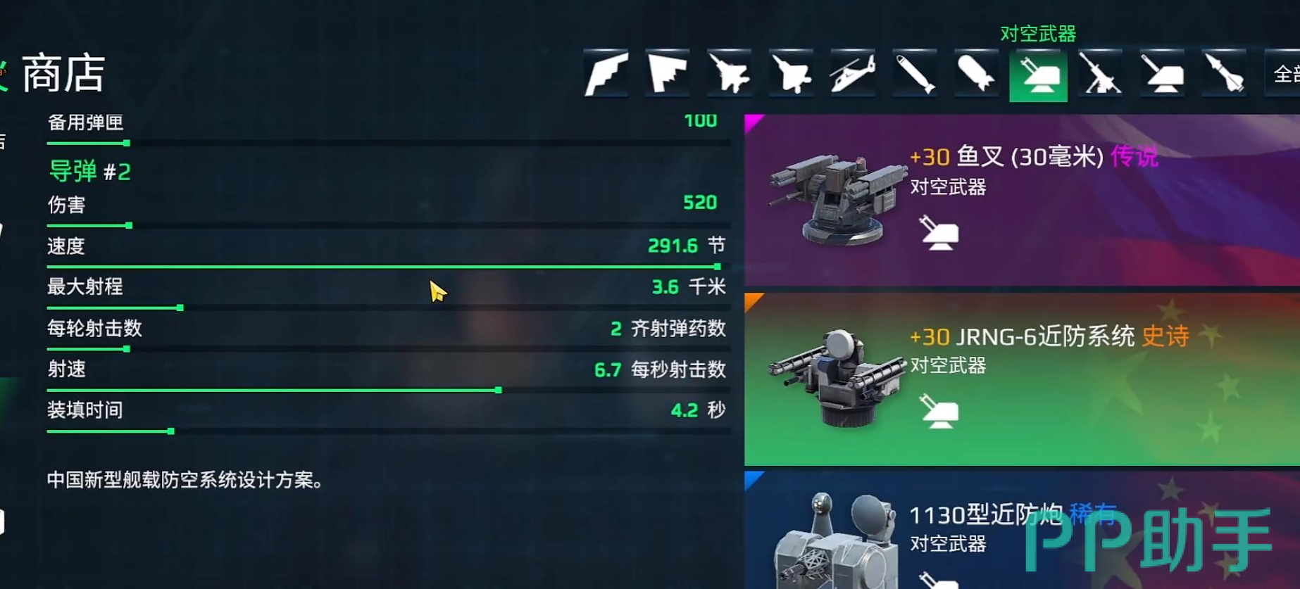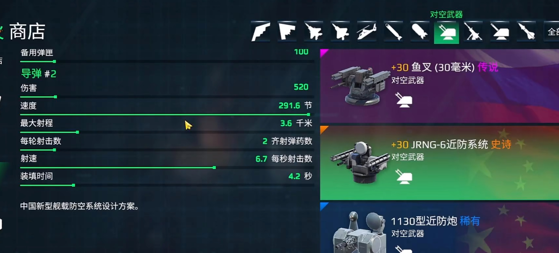 接下来就是防空导弹数据展示,jrng6防空导弹伤害为520,速度291.6节,最大射程3.6千米,射速6.7秒,装填时间4.2秒。鱼叉的伤害则是487,速度为272.1节,最大射程是3.5千米,射速5秒,冷却3.2秒。对比鱼叉的导弹速度更快,而且伤害更高,射程也比鱼叉的远。但是在射速和冷却上不敌鱼叉,所以鱼叉的秒伤是比jrng6要高的。