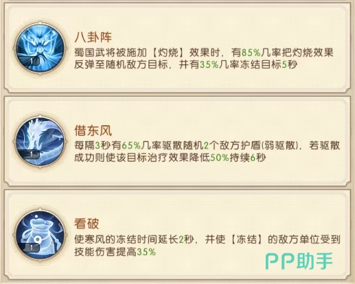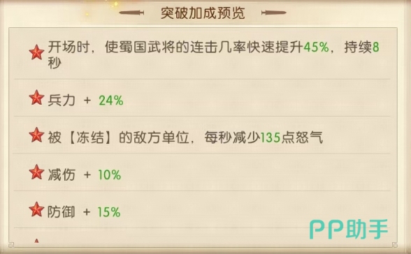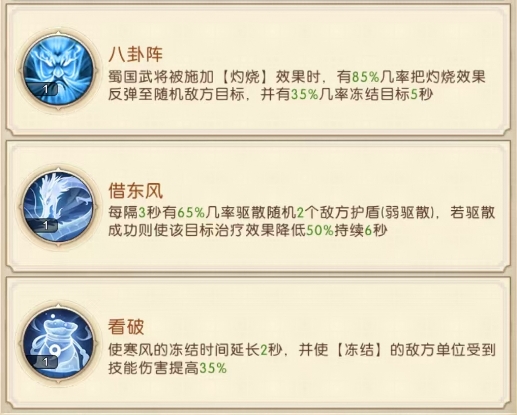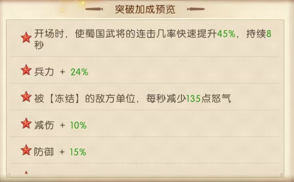 看破技能则是对寒风技能的强化升级,它使寒风的冻结时间延长2秒,增强了对敌方单位的控制时长,同时被冻结的敌方单位受到的技能伤害提高35%,这使得己方在敌方被冻结期间能够造成更高的输出伤害,从而更有可能在短时间内击败敌人,其实突破后的诸葛亮在开场时,能够使蜀国武将的连击几率迅速提升45%,这一效果持续8秒之久,在这一短暂而关键的时间窗口内,蜀国武将的攻击频率将得到提升。